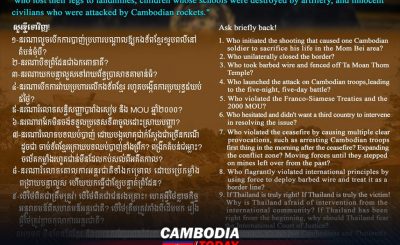 អនុវត្តតាមរូបមន្ត Don’t Thai to me! រដ្ឋមន្ត្រី៤ខែ នៃក្រសួងការបរទេសថៃ បានប្រឹងបំភាន់រៀបរាប់នៅវេទិកាមហាសន្និបាតអង្គការសហប្រជាជាតិថា “យើងដឹងថាអ្នកណាជាជនរងគ្រោះពិតប្រាកដ គឺទាហានថៃដែលបានបាត់បង់ជើងដោយសារមីន គឺក្មេងៗដែលសាលារៀនរបស់ពួកគេត្រូវបានបំផ្លាញដោយកាំភ្លើងធំ និងជនស៊ីវិលស្លូតត្រង់ដែលត្រូវបានវាយប្រហារដោយគ្រាប់រ៉ុក្កែតកម្ពុជា”។ ចោទសួរខ្លីទៅវិញ! ១-នរណាលួចបើកការបាញ់ប្រហារបណ្ដាលឱ្យកងទ័ពខ្មែរ១រូបពលីនៅតំបន់មុំបី? ២-នរណាបិទព្រំដែនជាឯកតោភាគី? ៣-នរណាយកបន្លាលួសទៅរាយព័ទ្ធប្រាសាទតាមាន់ធំ? ៤-នរណាបើកការវាយប្រហារលើកងទ័ពខ្មែរ រហូតបង្កើតការប្រយុទ្ធ៥យប់ ៥ថ្ងៃ? ៥-នរណារំលោភសន្ធិសញ្ញាបារាំងសៀម…