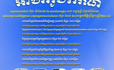 ១. សាកលវិទ្យាល័យអាមេរិកាំងភ្នំពេញ (AUPP) ថ្នាក់បរិញ្ញាបត្រ ជំនាញបច្ចេកវិទ្យាឌីជីថល សម្រាប់ឆ្នាំសិក្សា ២០២៥-២០២៦ ចំនួន ១០០ កន្លែង ដោយឆ្លងកាត់ការប្រឡង។ កាលបរិច្ឆេទទទួលពាក្យ៖ ចាប់ពីថ្ងៃជូនដំណឹងនេះ រហូតដល់ថ្ងៃទី៨ ខែតុលា ឆ្នាំ២០២៥ វេលាម៉ោង ១៧:០០ នាទី ជាកំហិត។…